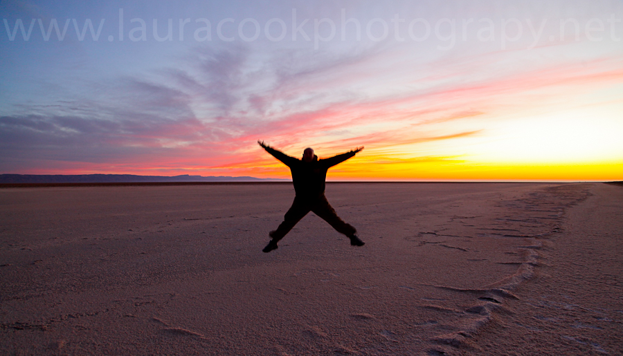 My husband leaps for the sky as the sun rises the next day over the salt flats of Chott El Jerid