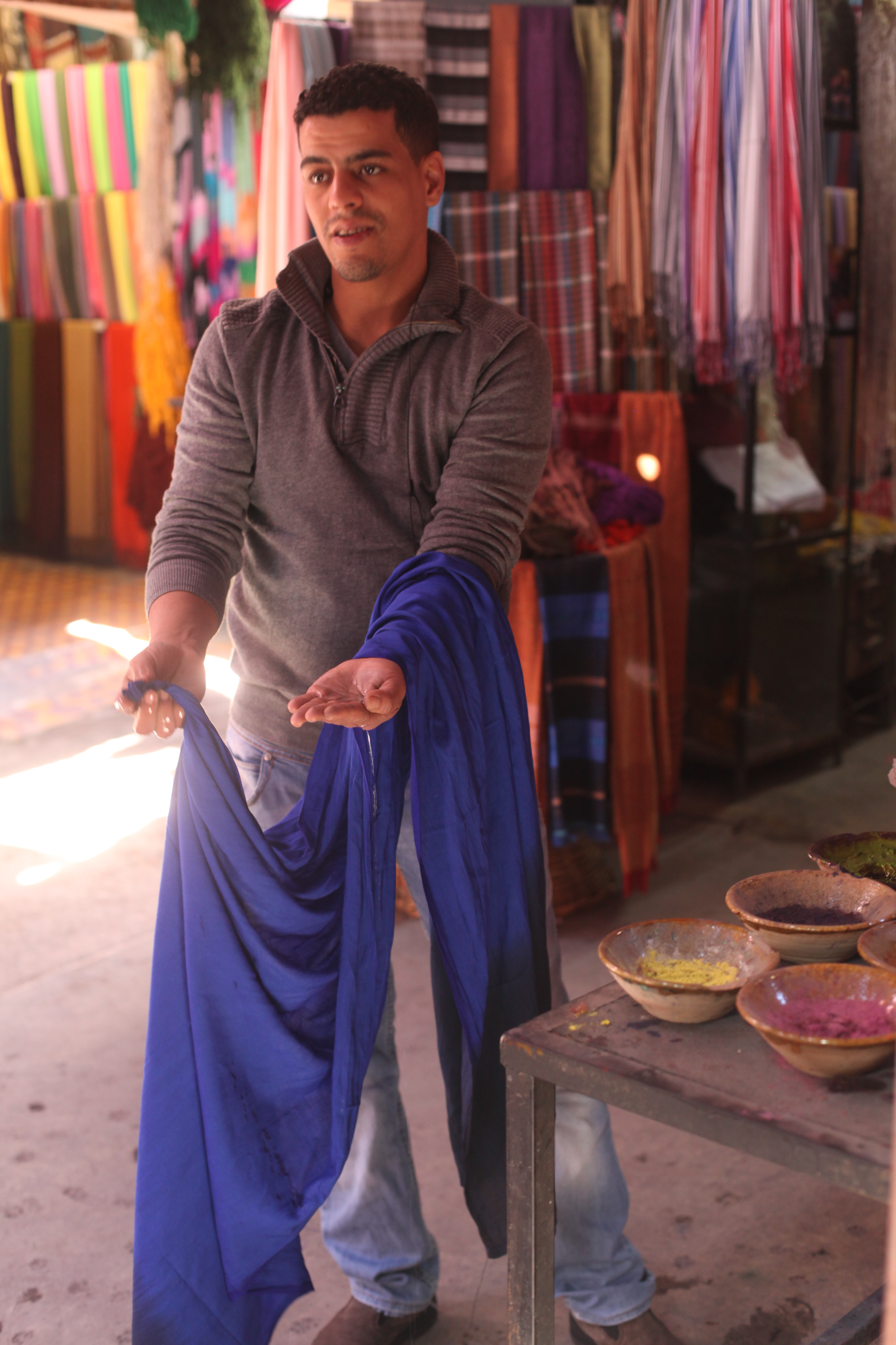 There are many souks within the walls of the world-famous Marrakech medina. One of the most colourful and interesting alleyways that you can get lost in is the dyer’s souk. This part of bazaar is draped with material and yarn hanging from the wooden rafters that block out the harsh sun. Moroccan sellers bustle and hustle tempting tourists in to the souk to share in their knowledge of the dying process (and of course buy some of their wares!):