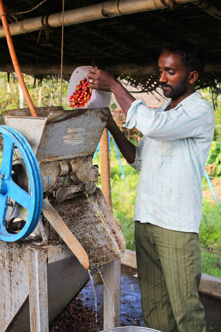 Cherries are then processed. The freshly harvested cherries are passed through a pulping machine where the skin and pulp is separated from the bean.