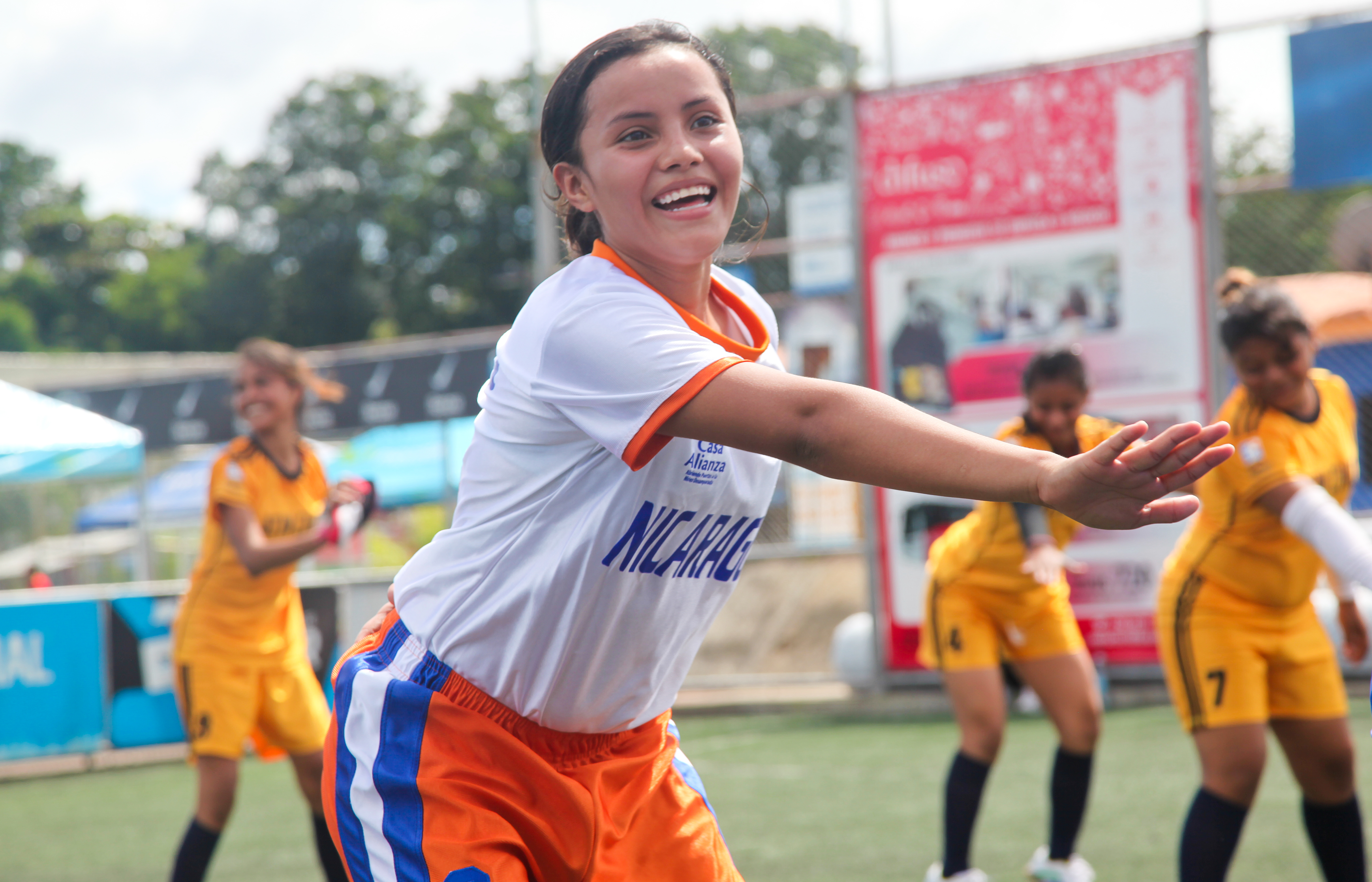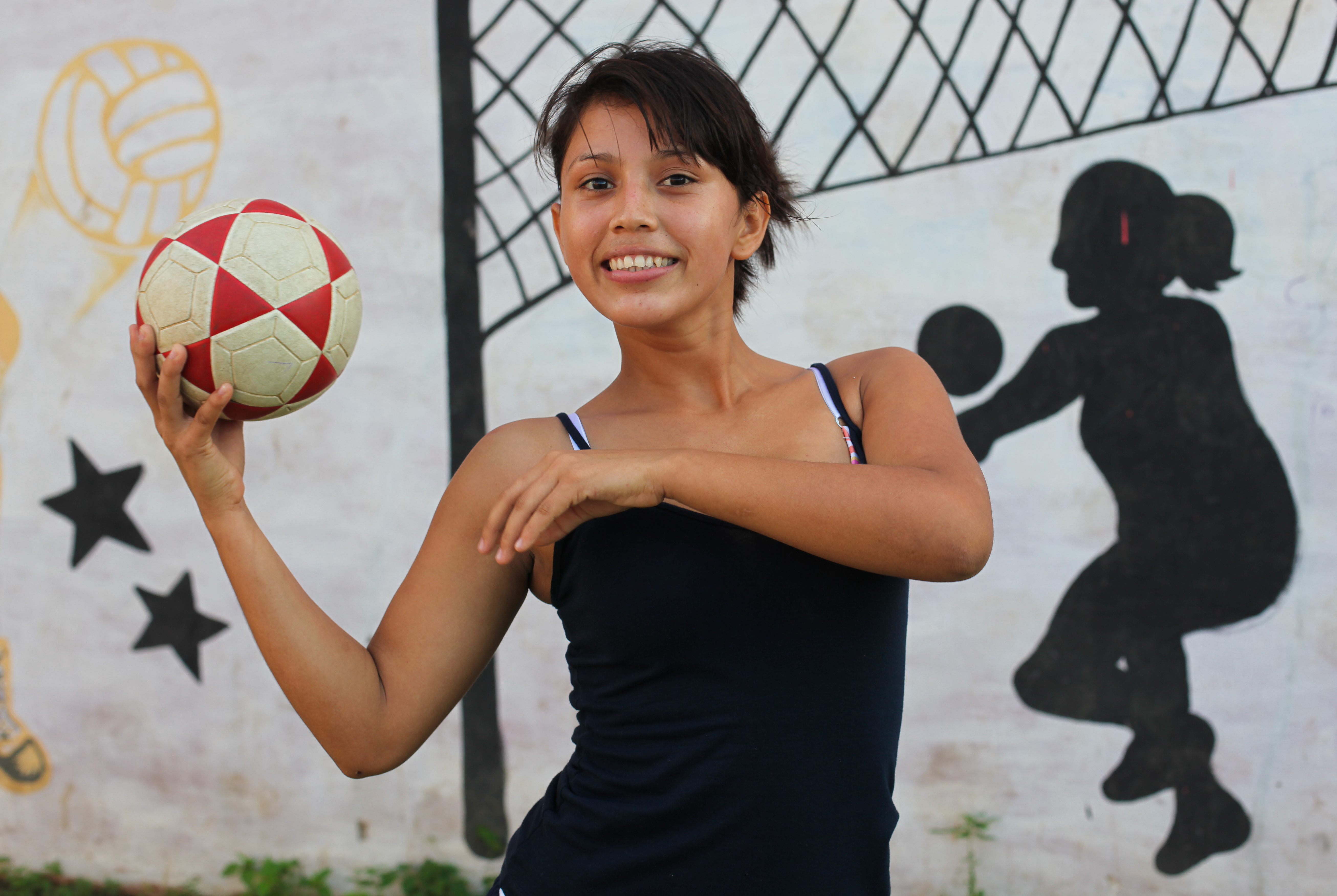 Sport is another key way of engaging and encouraging the young people. Here Alondra (a member of Team Nicaragua’s female team) holds a football aloft.